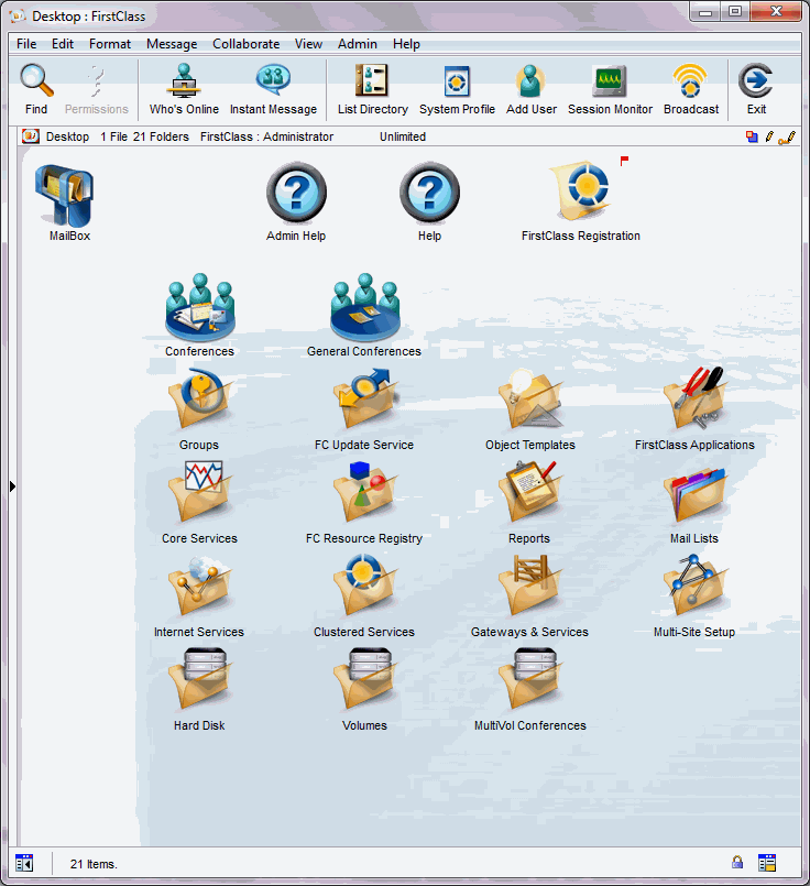 For more information about the files in these folders, see the Administration section of the FirstClass online help.