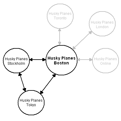 Here again is the Husky Planes network, this time with Directory synchronization enabled (shown as a “D” on each server).