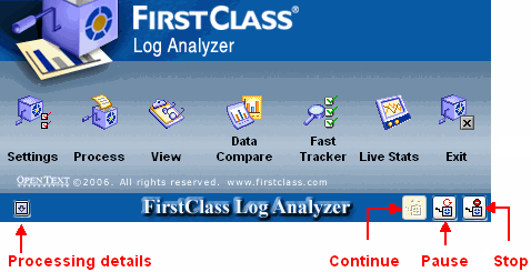 While the statistics file(s) is being processed, click the buttons at the bottom of the Log Analyzer main window to: