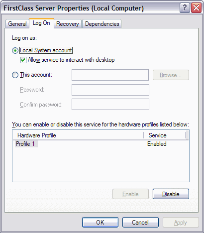 There are some workarounds to this problem, but they are often complex, and either unreliable or awkward in one way or another. FirstClass customers have sorted this out using a variety of approaches, sometimes simply by not running the FirstClass server as a Windows service.