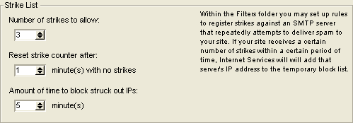 Basically, if your site receives a certain number of strikes (bad connection attempts) from an IP address within a certain period of time, Internet Services adds it to a temporary block list for a certain period of time, which you set on the Junk subtab on the UCE/Spam tab. You can log the temporary list to a permanent file and clear entries from the Control tab on the Internet Services Monitor form.