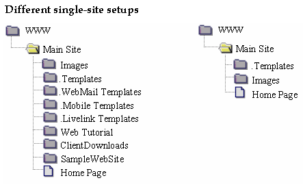 In all cases, the basic site structure is the same. The only required objects are a template set, Images container, and Home Page document. Here are some examples of different web site structures you could have, although you can have many different ones according to your needs:
