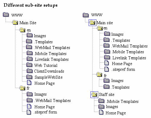If you support multiple sites or multiple sites and languages, each site must have a separate container and unique name. For multiple-language sites, you must have a separate subfolder for each language. You must also manually enter each site's information in the Multiple Sites & Languages form. For information on how to create a web site, see Creating a FirstClass web site.