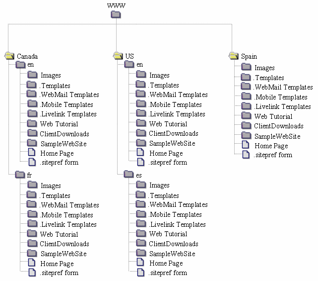 In the above example, Husky Planes has three different web sites: Canada, US, and Spain, each pointing to the same server machine. Canada and US each have separate folders for the two different languages they support. Each container has a home page in its respective language. Husky's administrator has placed English, French, and Spanish language files in the Resource Registry.