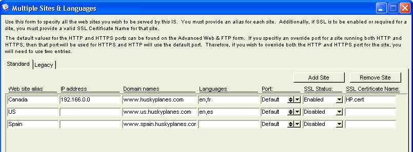 Let’s take a look at an example of the different web sites and languages configured on Husky Planes: