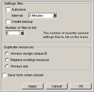 You can customize how FirstClass Designer behaves in a number of ways. For example, you can specify what to do when duplicate resource IDs are detected, and whether to automatically save your work.