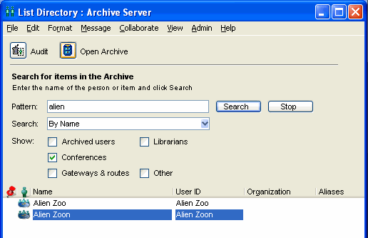 4 Select the desired user or conference from the list and click Open Archive.