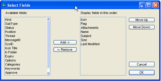The fastest way to add or remove standard or custom columns is to right-click (Win) or control-click (Mac OS) in a container's window, and choose "Select Fields". Choose which fields to add or remove from the container, and the order in which they will be displayed.