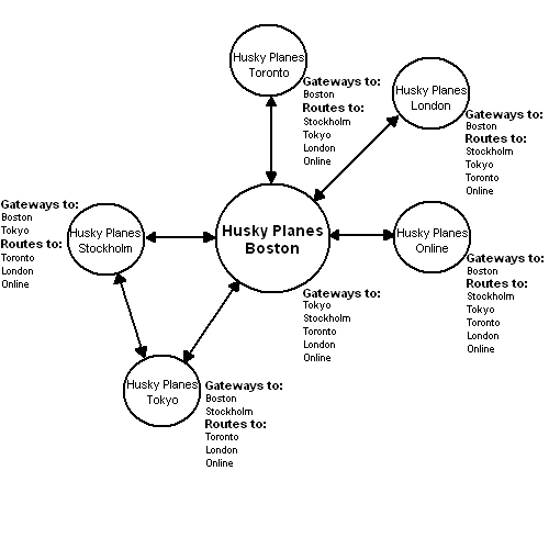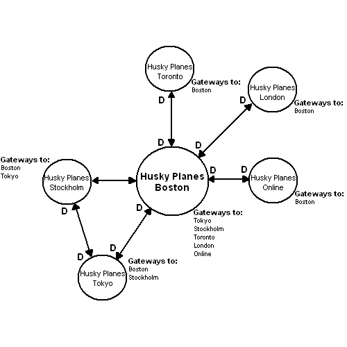 Here again is the Husky Planes network, this time with Directory synchronization enabled (shown as a “D” on each server).