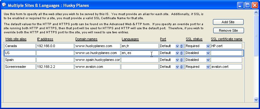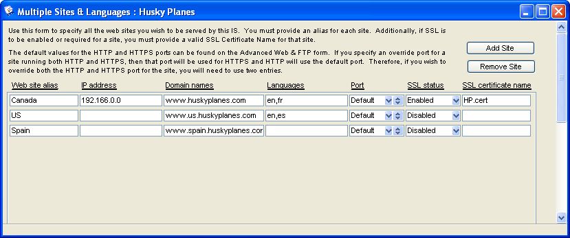 Each site has a different alias name (but same IP address) corresponding to a different site container in the WWW folder. All the domains resolve back to the same IP address. Since each site supports different languages we entered the language ISO codes in "Languages" (for example, fr for French or es for Spanish, see Understanding Internet Services resources). The order of the languages is important only for the first language, as it is considered the default. After this, you can place the languages in any order.
