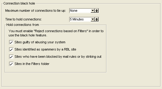 To blackhole unwanted connections, you must select "Reject connections based on Filters" on the Connections tab on the Basic Internet Setup form and have the IP address listed in your filter documents in the Filters folder. You then set the parameters in the Connection black hole section on the Connections tab.