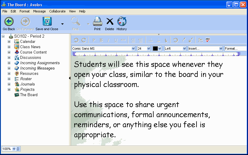 The Board is your and your students' initial view of your online class, similar to the white board or chalk board in your physical classroom. Use this space to post urgent messages, formal announcements, or anything else you feel is appropriate.