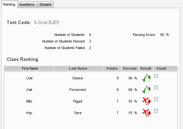 The Reporting tool generates a comprehensive report for the entire class, or for individual students. You can create summaries of all correct or incorrect answers, rankings, and other test statistics, and you have the option of emailing the report out.
