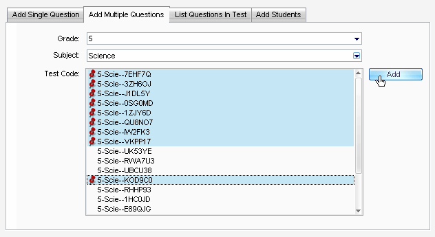 On the Add Multiple Questions tab, select the Grade and Subject of the questions you wish to add.