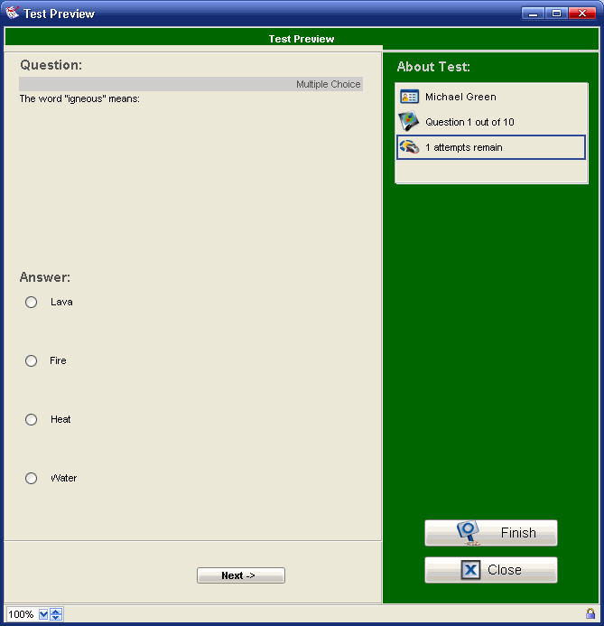 Click Preview to see what the test will look like to students. If you need to make changes, exit the preview (Finish) and click Edit on the Create Test form.