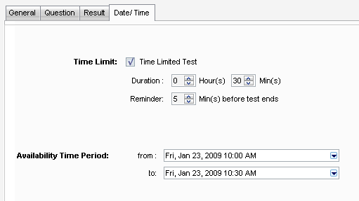 4 On the Date/Time tab, select whether the test will be limited to a specific time (Time Limted Test). If so, indicate how long the test will be (Duration), set a reminder if desired (Reminder), and indicated the time period for when the test will be available for students to take Availability Time Period).