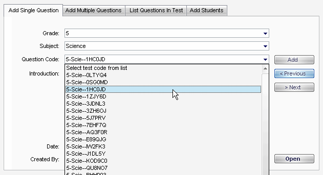 On the Add Single Question tab, select the Grade, Subject, and Question Code of the question you wish to add, and then click Add.