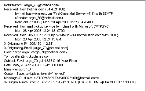 To see an Internet header in a message, choose View > Show Internet Headers in the FirstClass client: