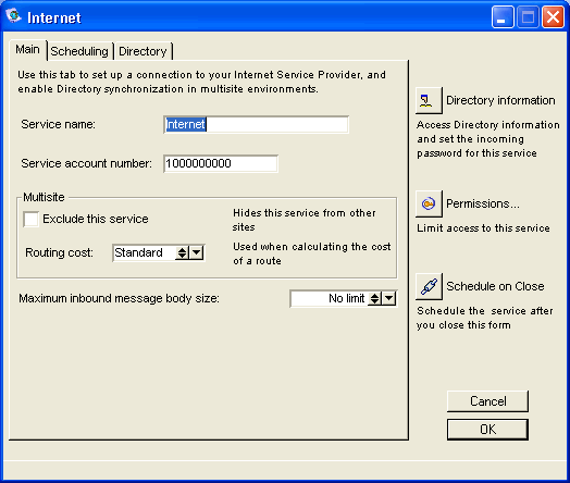 The Main tab on the Internet gateway form (located in the Gateways & Services container on the administrator's Destkop) contains general information about your account and Directory synchronization. In order for the gateway to connect to the server, the name entered in "Service name" must match the gateway name entered in the "Service account" on the Service tab of the Basic Internet Setup form.