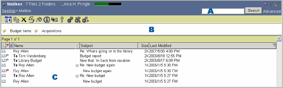 A pane is a section of a window (or web page), divided from other panes by split bars. Panes contain different types of objects. For example, a window may have containers in the upper pane and messages and documents in the lower pane. For messages and documents, the upper pane is the envelope. The main pane displays the contents of an open container (a conference, folder, calendar, or any other FirstClass object that contains items) or an open object such as a message. This pane can take up all the space to the right of the side toolbar, or it can be shown to the right of the navigation pane. |